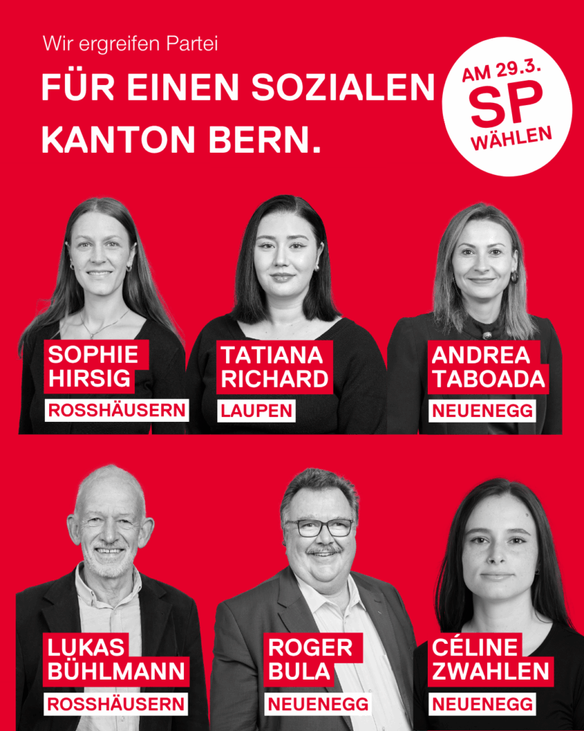 - Die SP konnte in diesem Jahr mit sechs Kandidat:innen aus der Region antreten: Tatiana Richard aus Laupen, Sophie Hirsig und Lukas Bühlmann aus Rosshäusern, Andrea Taboada und Roger Bula aus Neuenegg. Und nicht zu vergessen: Auf der Liste der Juso war Céline Zwahlen aus Neuenegg ebenfalls angetreten.