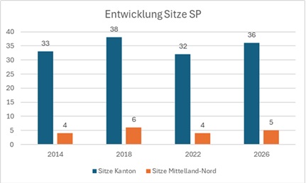 - Die Wähleranteile der SP in unserem Wahlkreis konnten wir von 19.0% auf 21.9% steigern. Das führt auch zu einem zusätzlichen Sitz auf der Männerliste der SP. Dieser ging an Jonas Ammann. Im ganzen Kanton konnte die SP vier zusätzliche Sitze holen